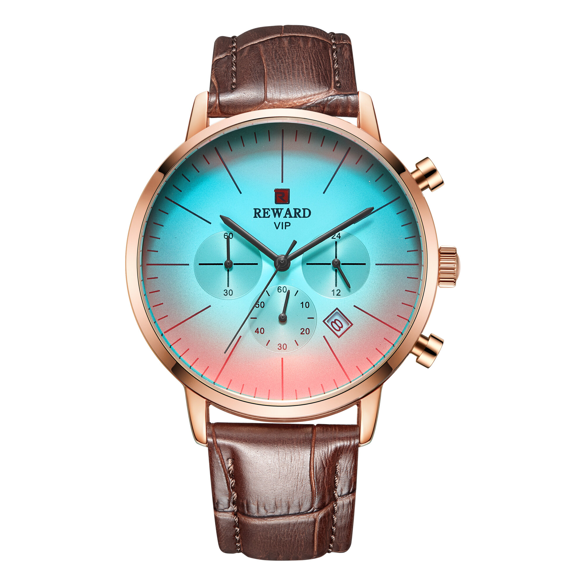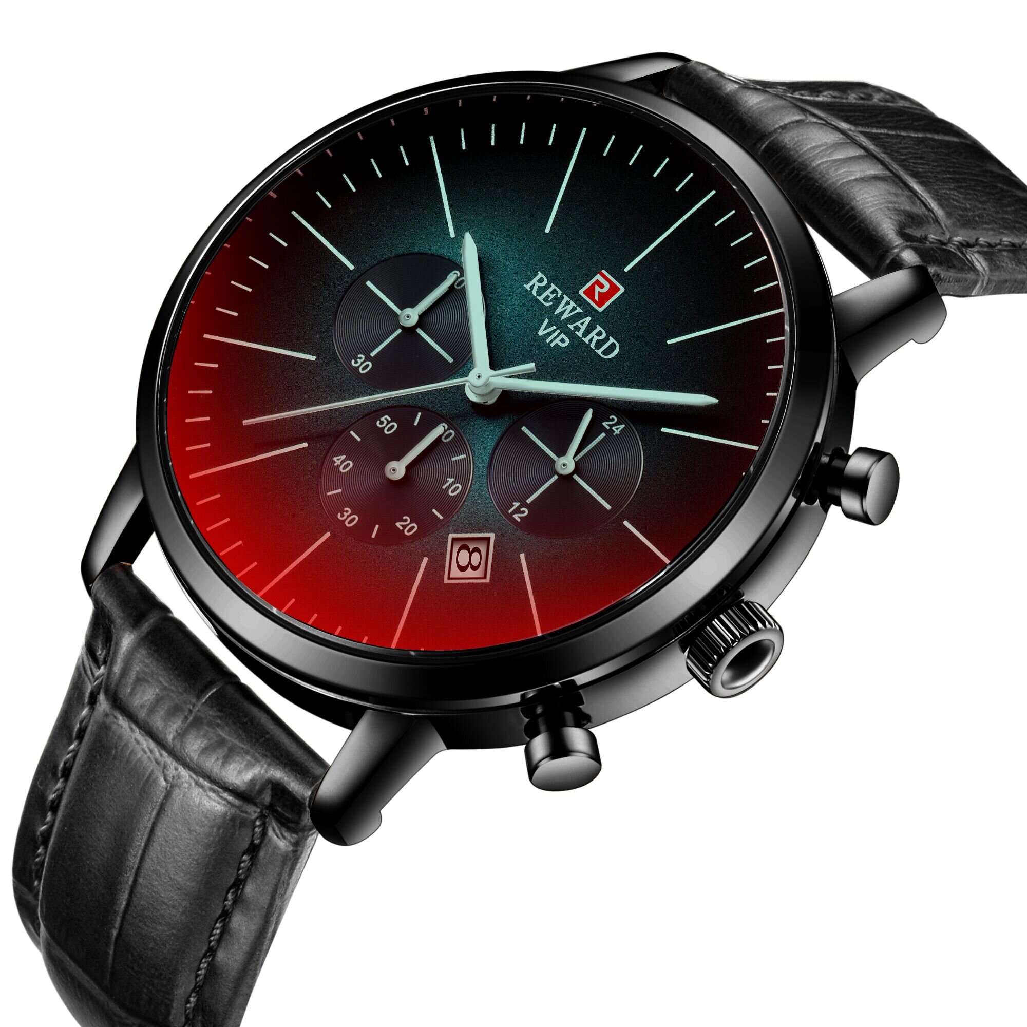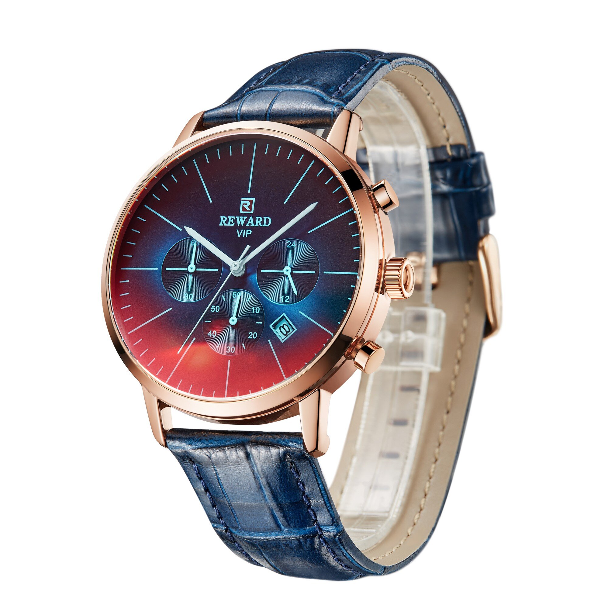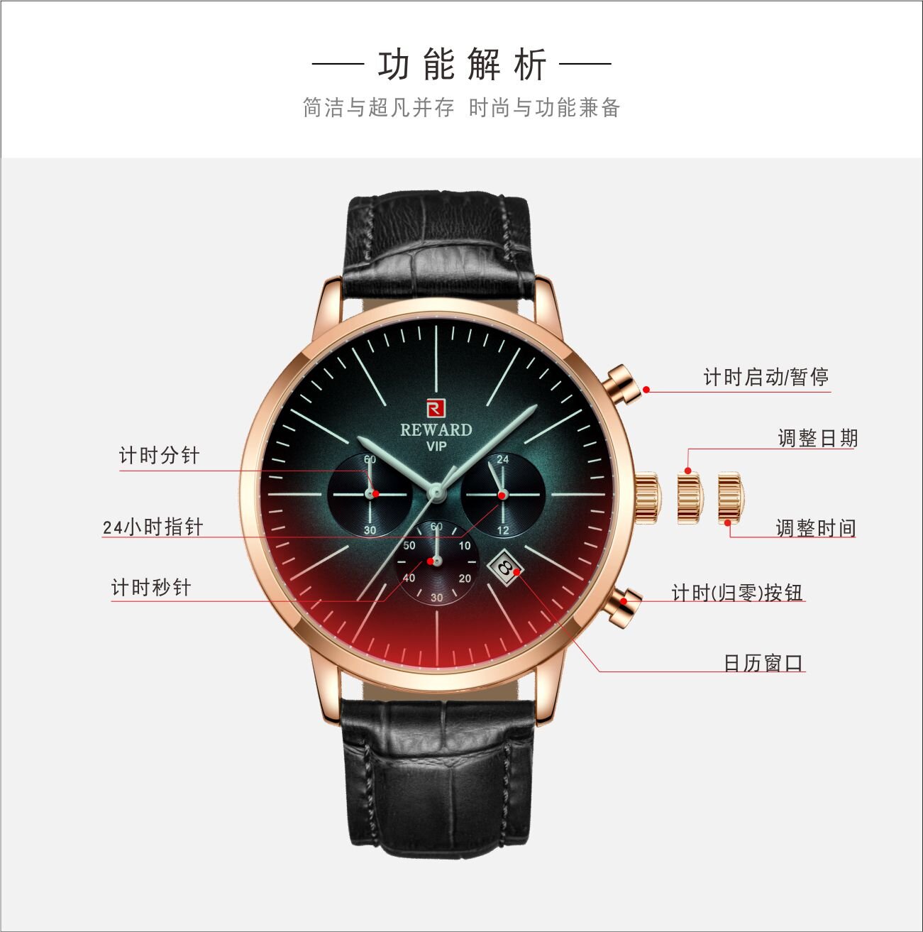 | Descript | 运动计时六针表镀膜炫彩矿物质玻璃表带,日历、24小时,最大六十分钟计时运动腕表,夜光,头层真皮表带 | ||