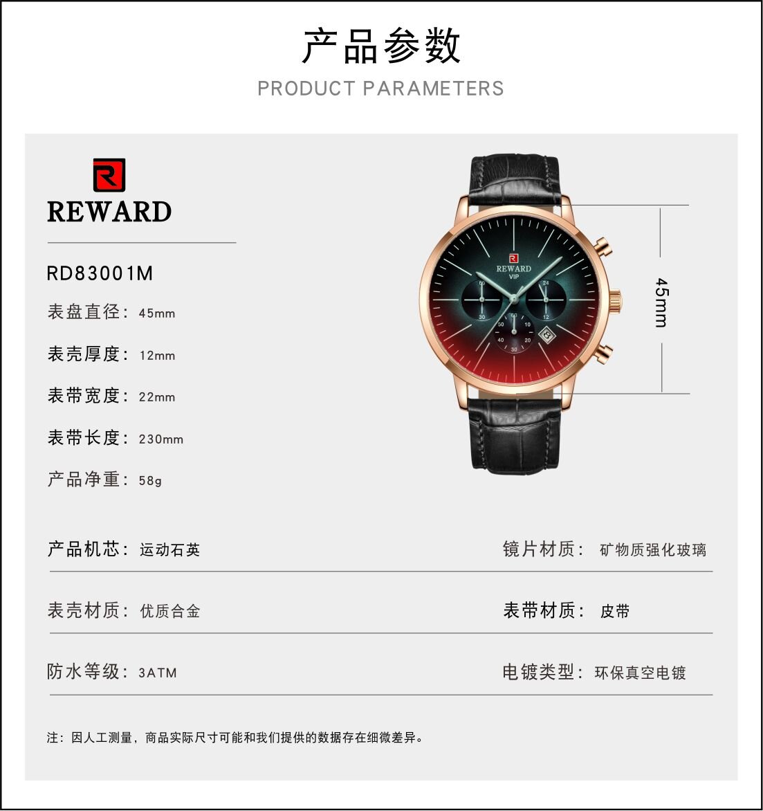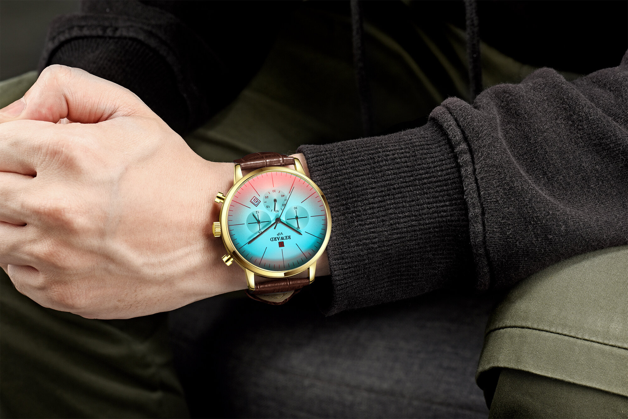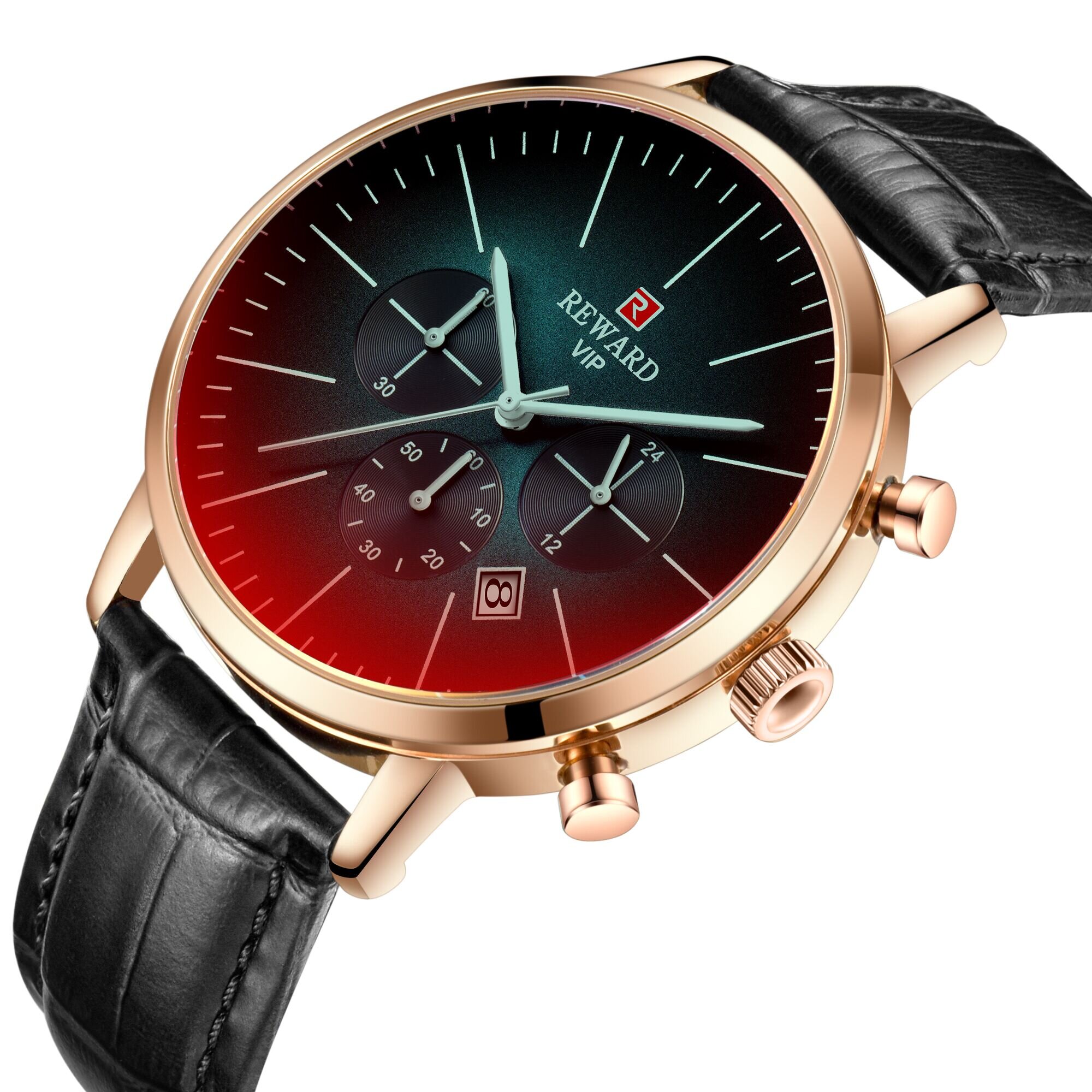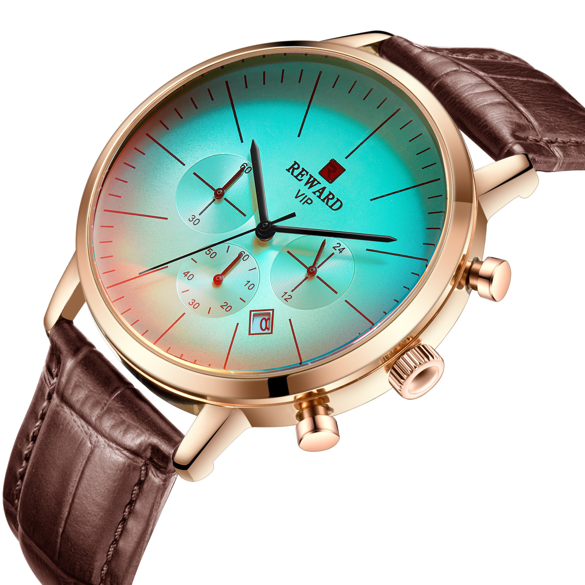 | Descript | 运动计时六针表镀膜炫彩矿物质玻璃表带,日历、24小时,最大六十分钟计时运动腕表,夜光,头层真皮表带 | ||