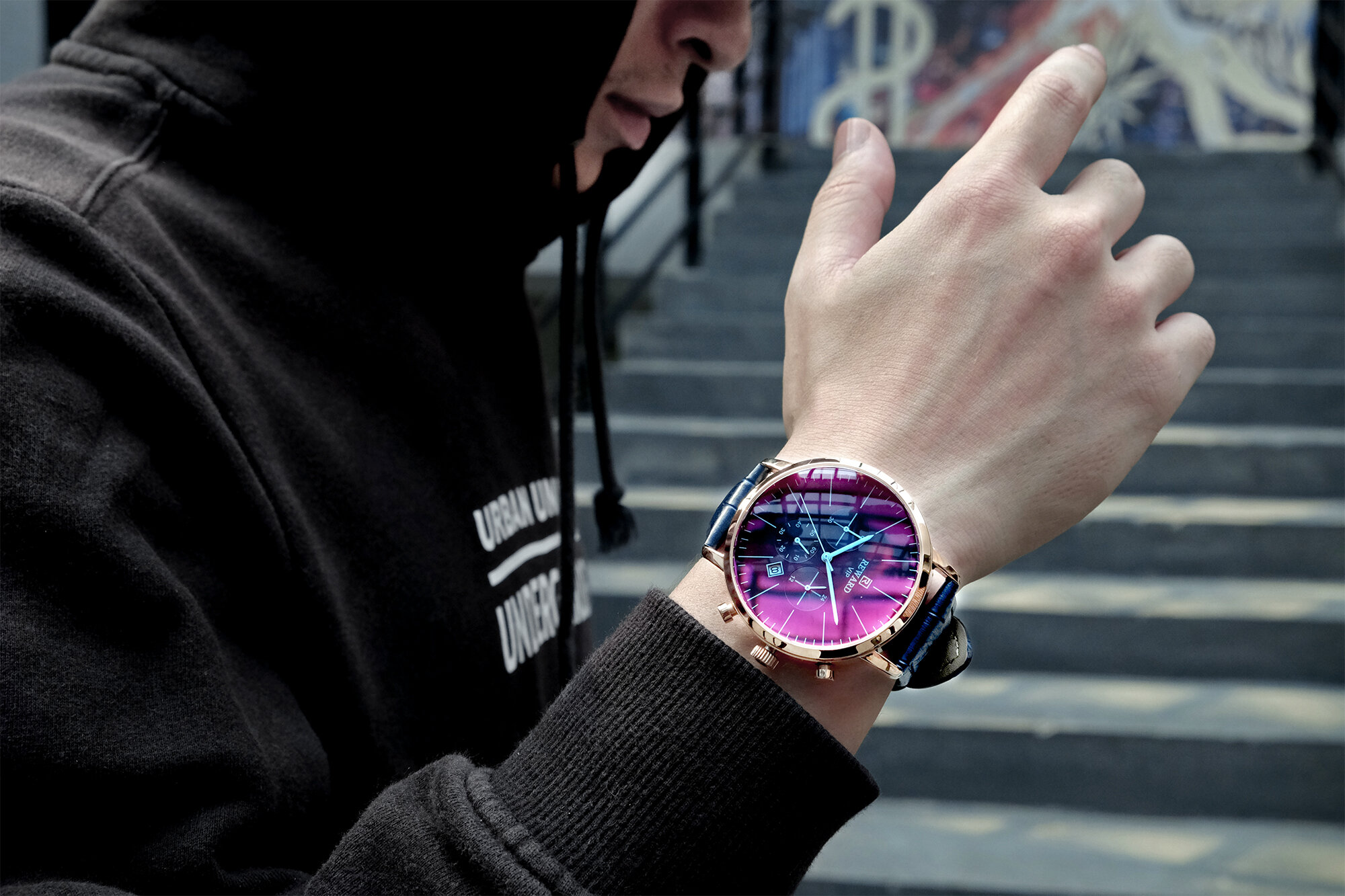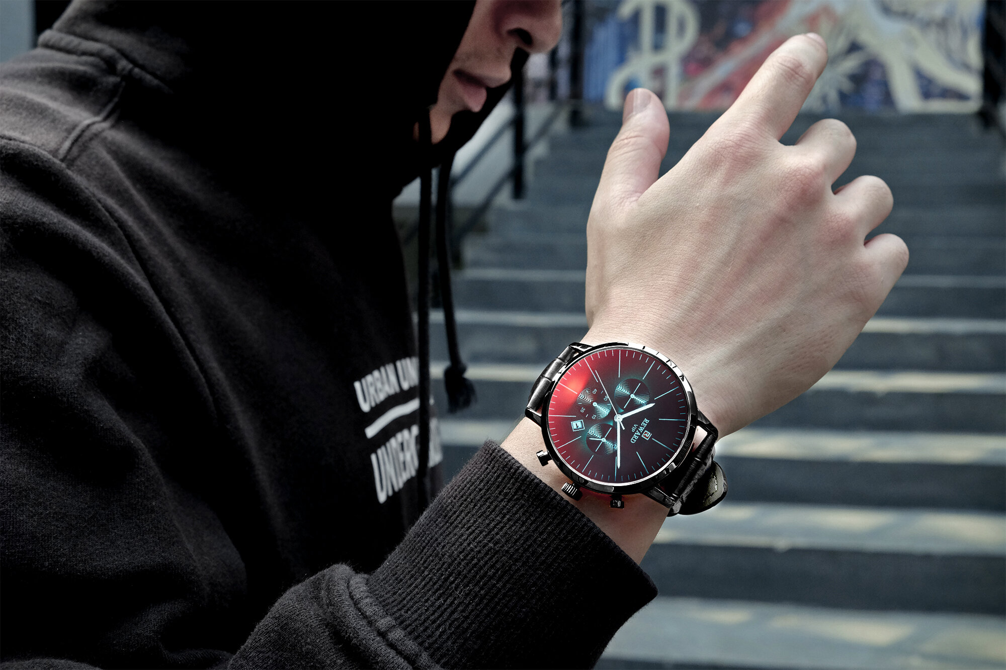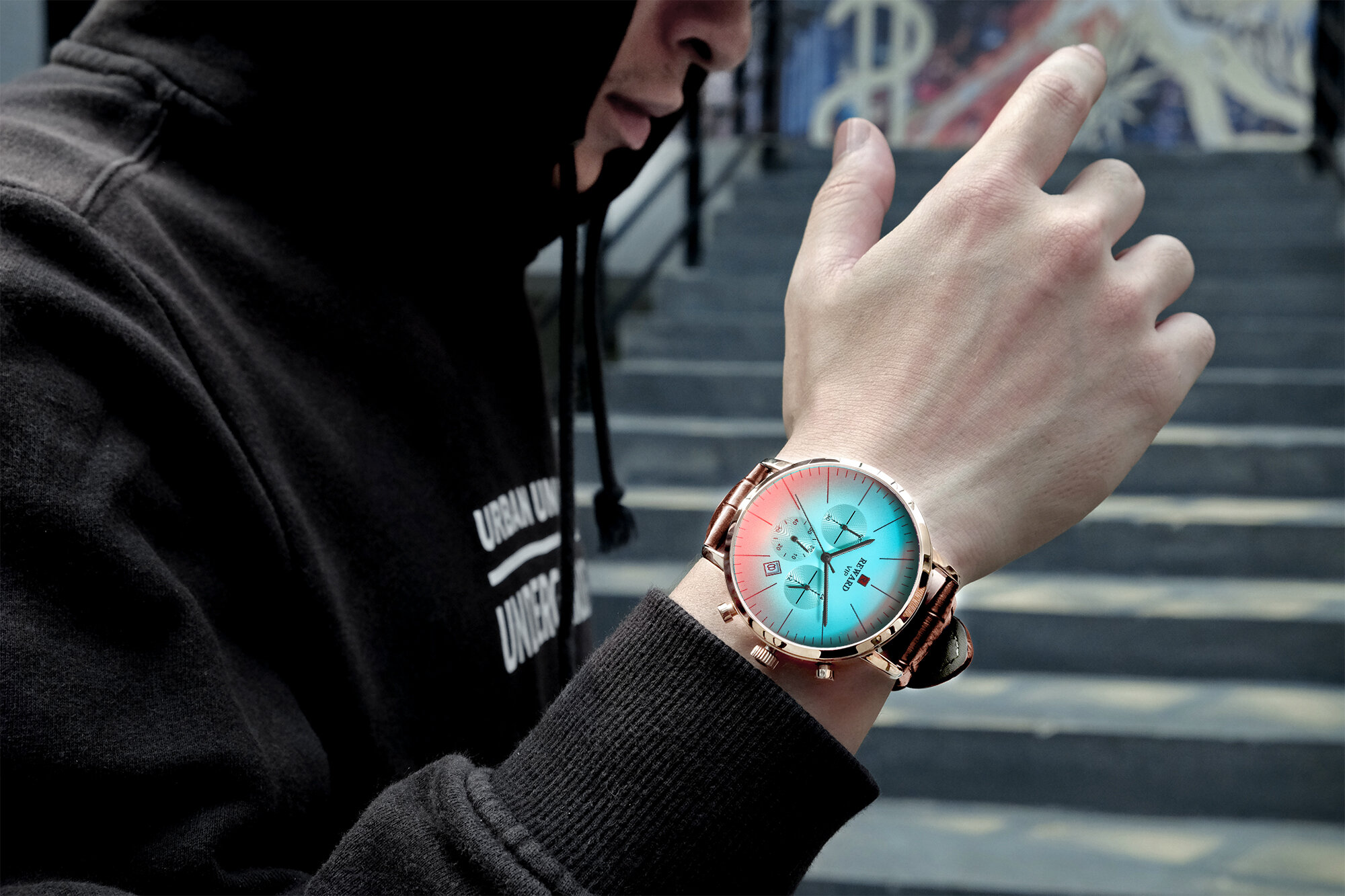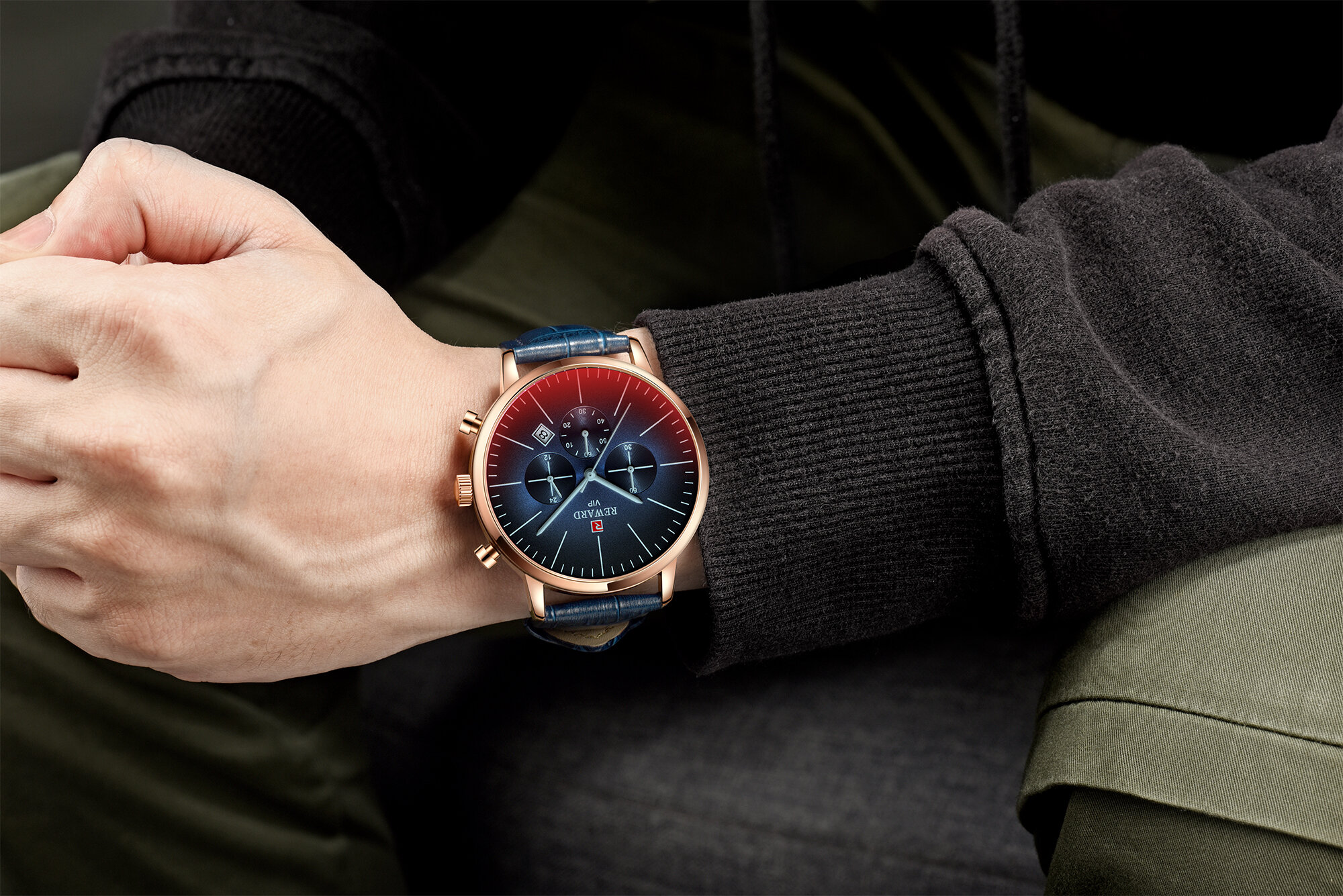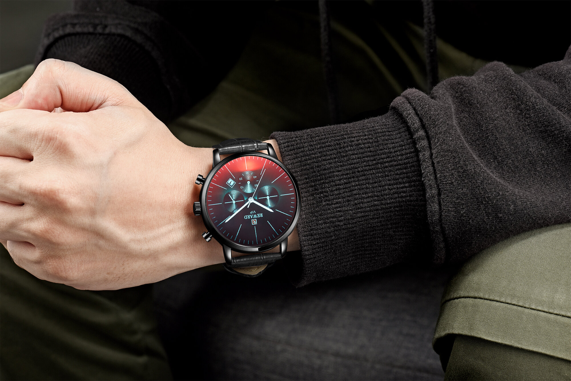 | Descript | 运动计时六针表镀膜炫彩矿物质玻璃表带,日历、24小时,最大六十分钟计时运动腕表,夜光,头层真皮表带 | ||