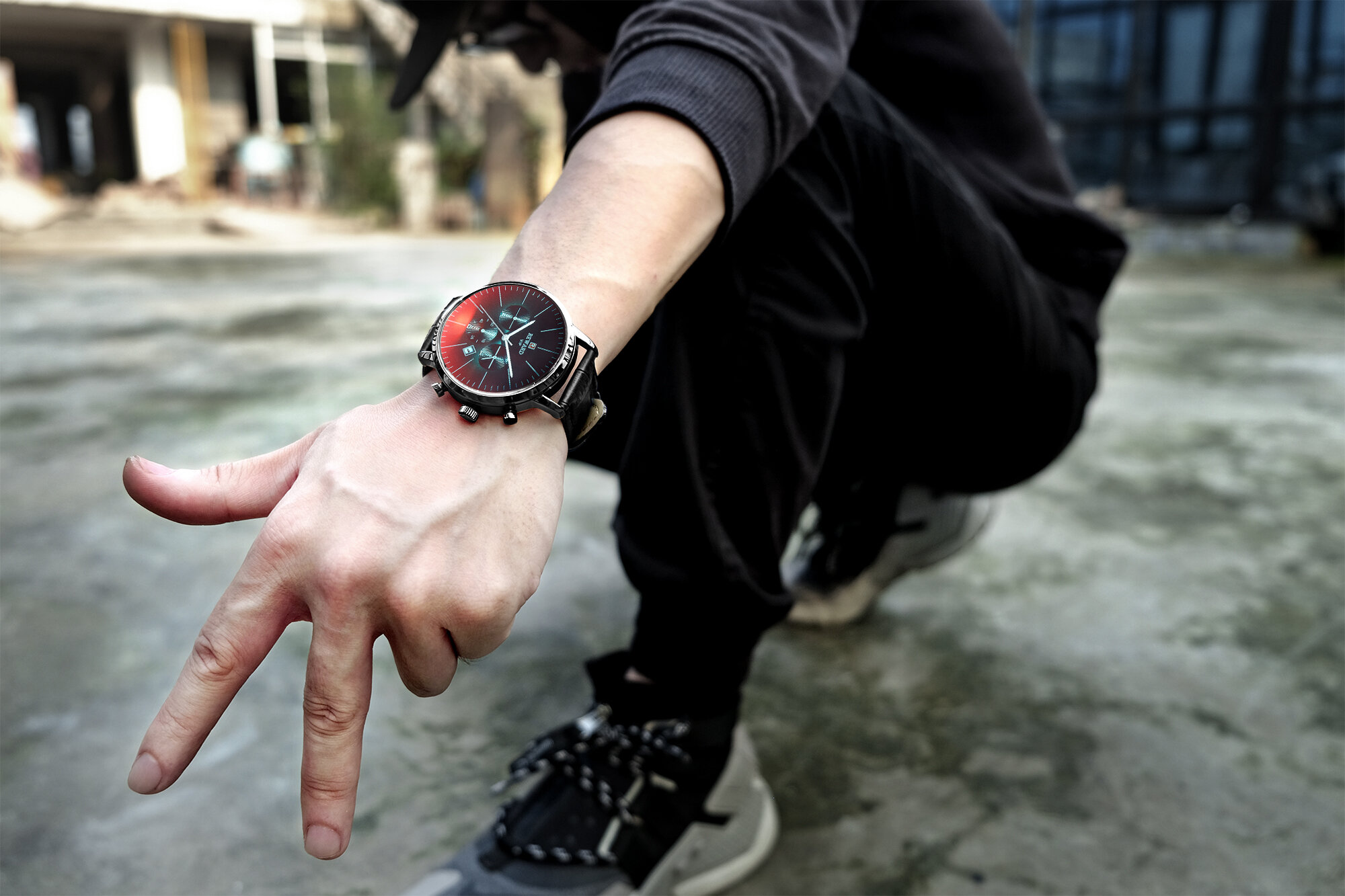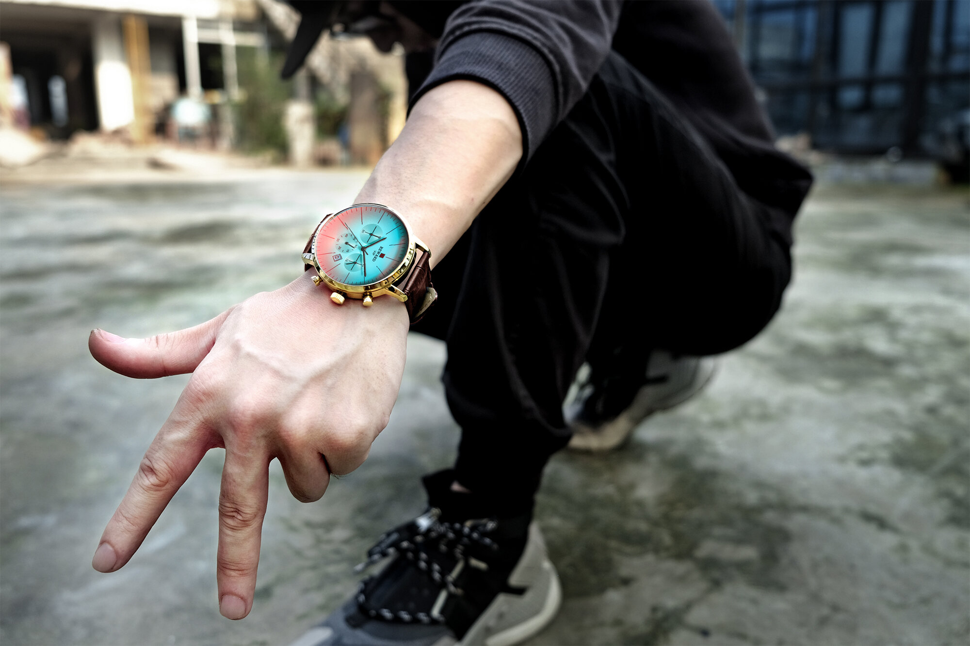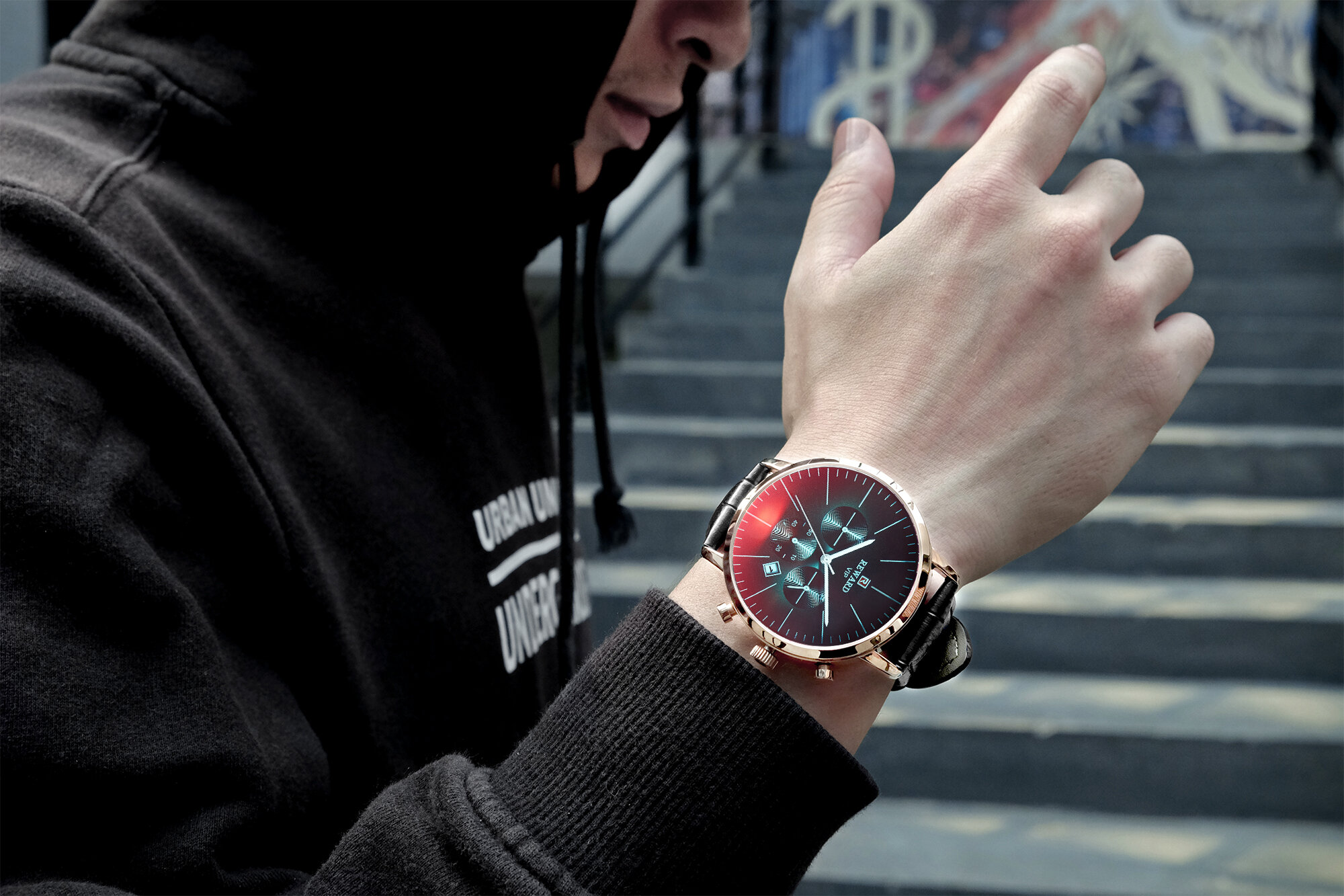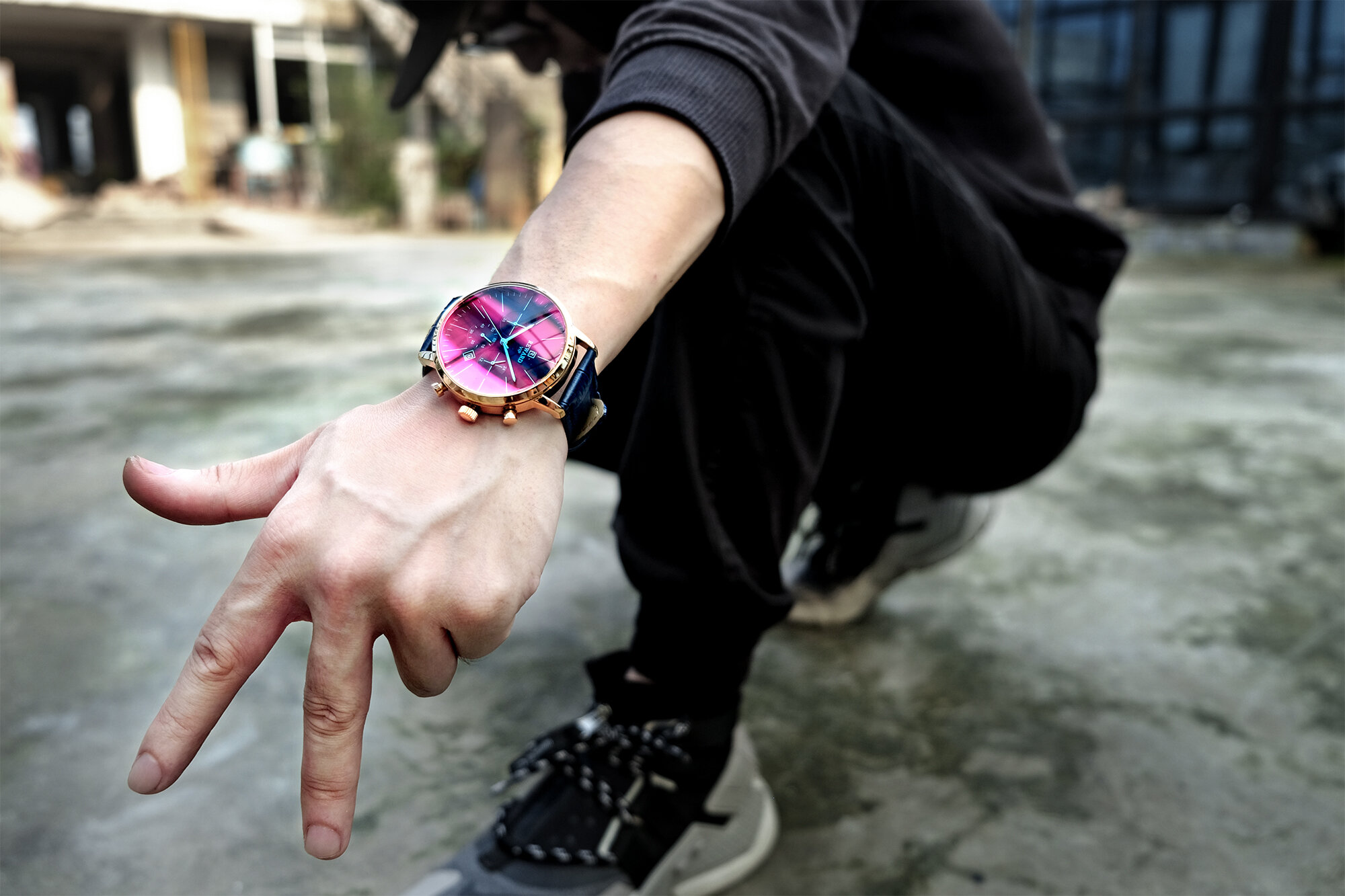 | Descript | 运动计时六针表镀膜炫彩矿物质玻璃表带,日历、24小时,最大六十分钟计时运动腕表,夜光,头层真皮表带 | ||