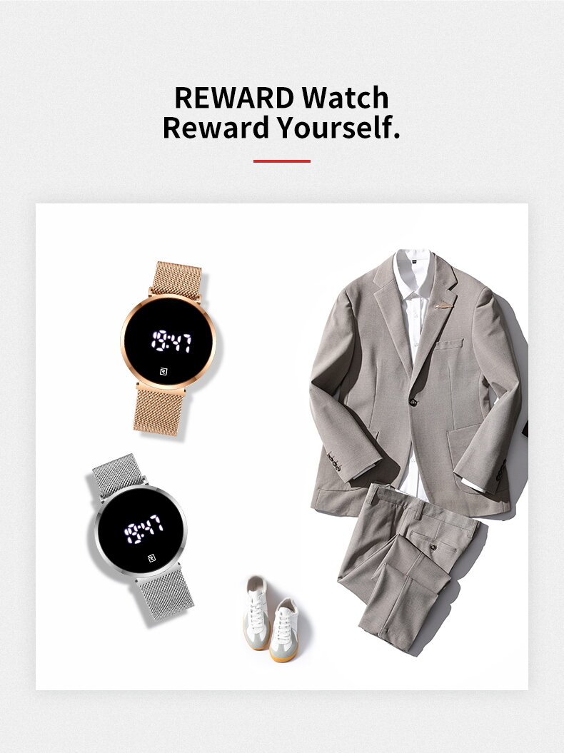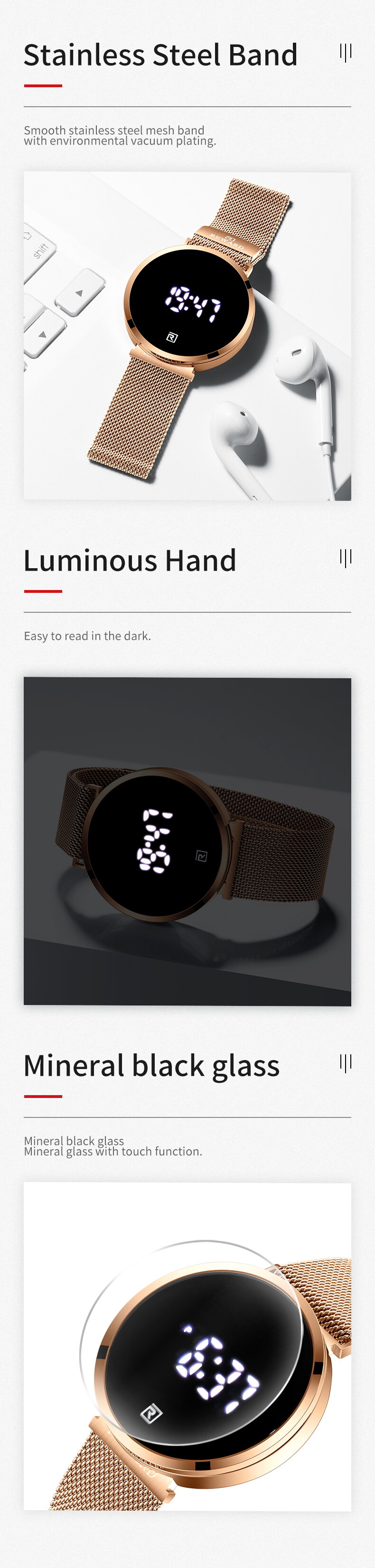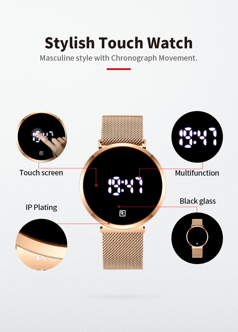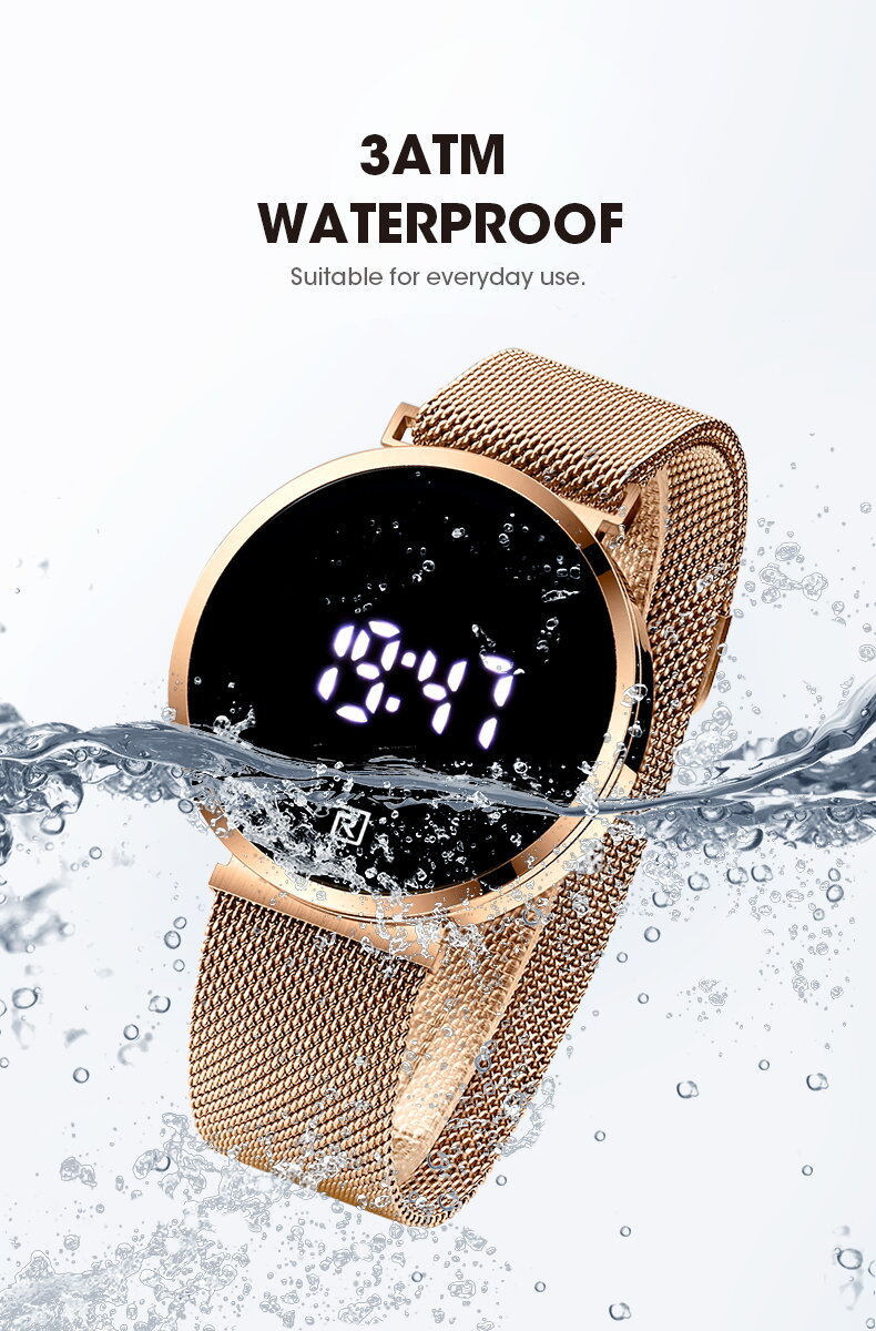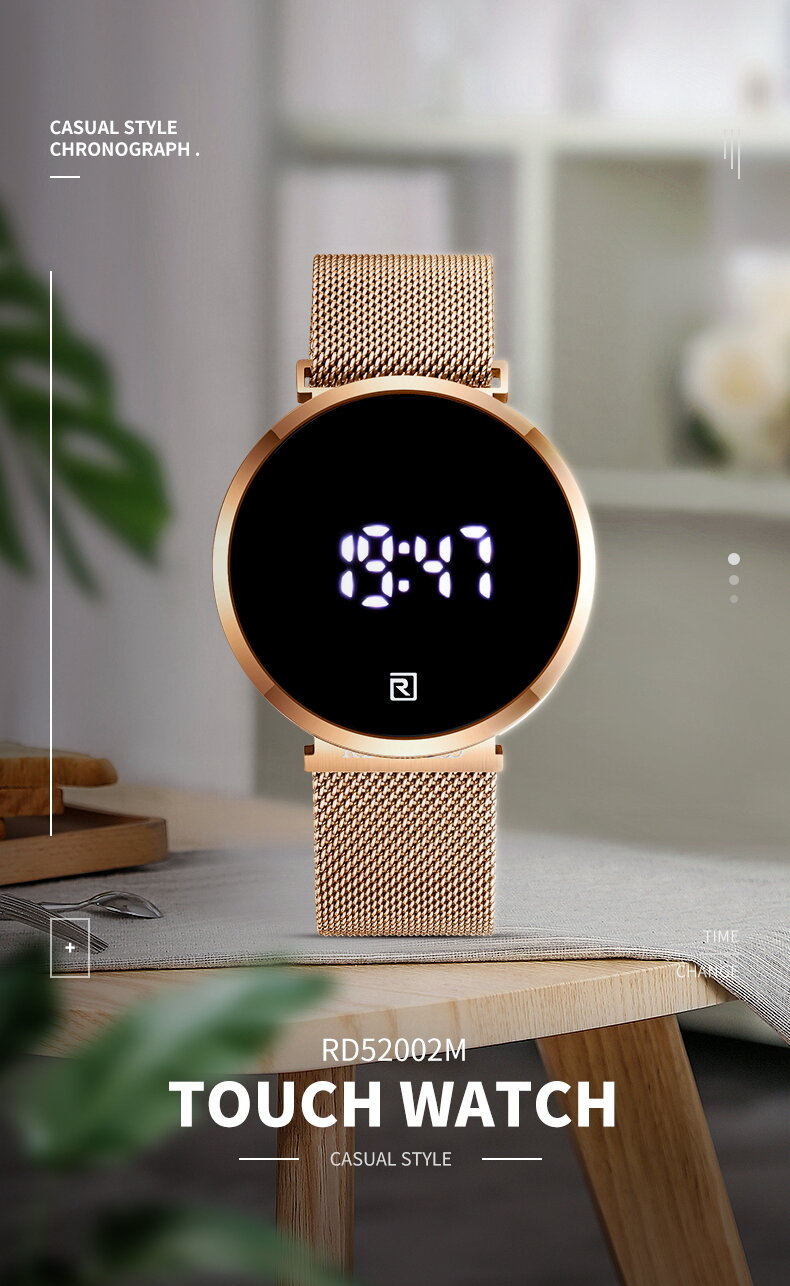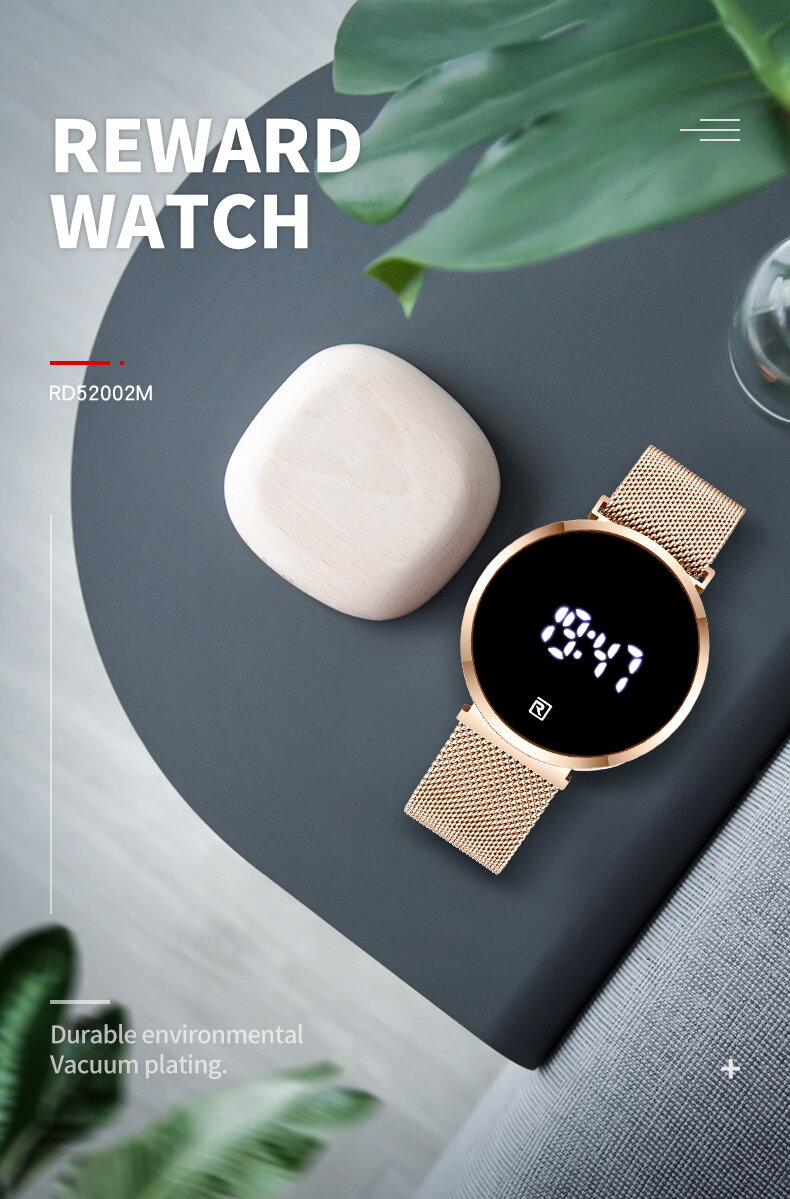 | Descript | LCD时间显示 30米生活动防水,免除碰水摘表的麻烦 表壳使用金属材质,IP环保真空电镀,着色更持久 不锈钢米兰网带,真空电镀,更耐用更柔软更有质感 自动灭屏,更省电,轻触显示,更方便 | ||